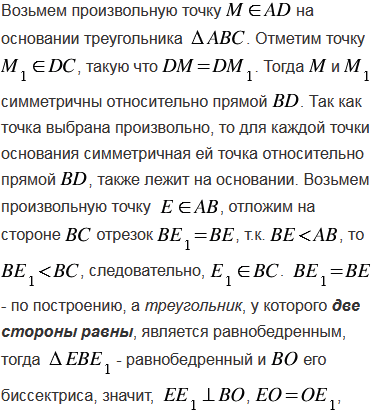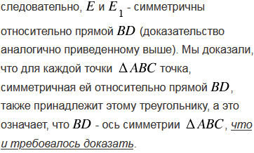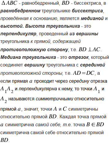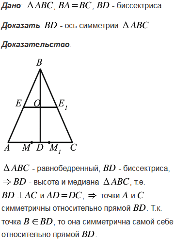 Докажите, что прямая, содержащая биссектрису равнобедренного треугольника, проведённую к основанию, является осью симметрии треугольника.