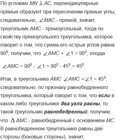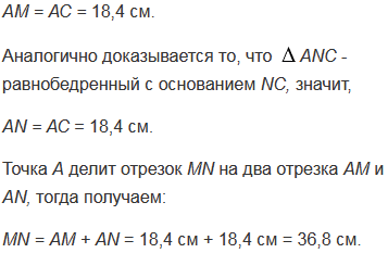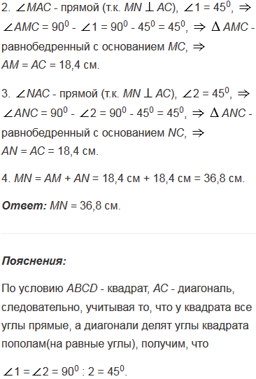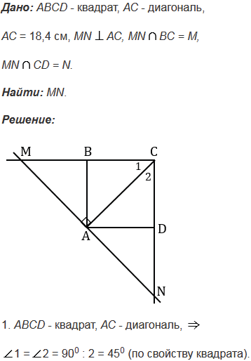 Диагональ АС квадрата АВСD равна 18,4 см. Прямая, проходящая через точку А и перпендикулярная к прямой АС, пересекает прямые ВС и СD соответственно в точках М и N. Найдите МN.