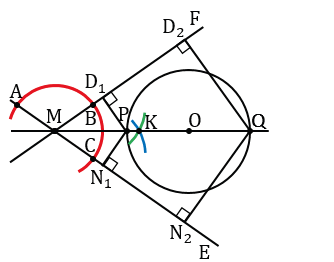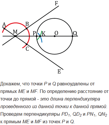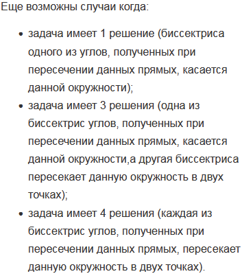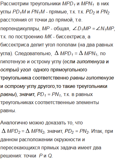 На данной окружности постройте точку, равноудаленную от двух данных пересекающихся прямых. Сколько решений может иметь задача?