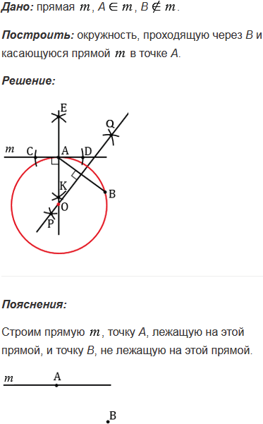 Даны прямая , точка A на прямой и точка B, не лежащая на этой прямой. Постройте окружность, проходящую через точку B и касающуюся прямой в точке A.