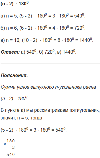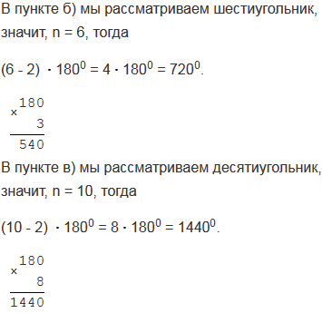 Найдите сумму углов выпуклого: а) пятиугольника; б) шестиугольника; в) десятиугольника.