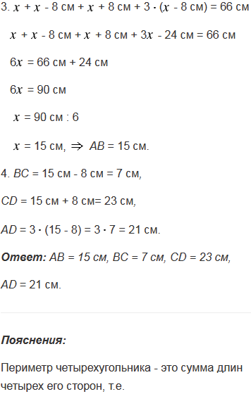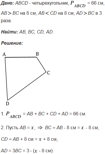 Найдите стороны четырехугольника, если его периметр равен 66 см, первая сторона больше второй на 8 см и на столько же меньше третьей стороны, а четвертая - в три раза больше второй.