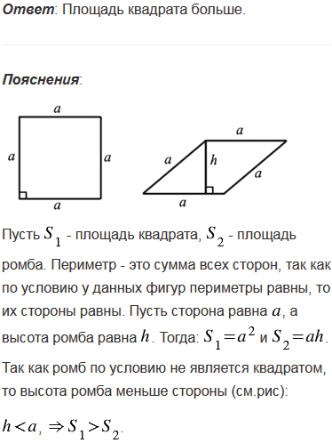 Квадрат и ромб, не являющийся квадратом, имеют одинаковые периметры. Сравните площади этих фигур.