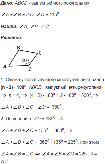 Найдите углы А, В и С выпуклого четырехугольника АВСD, если А =В =С, а D = 1350.