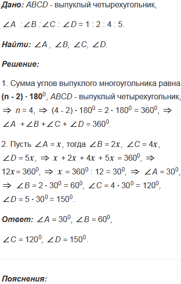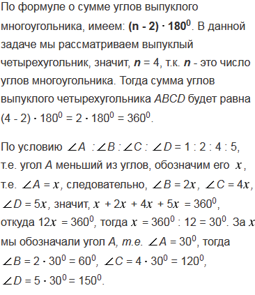 Найдите углы выпуклого четырехугольника, если они пропорциональны числам 1, 2, 4, 5.