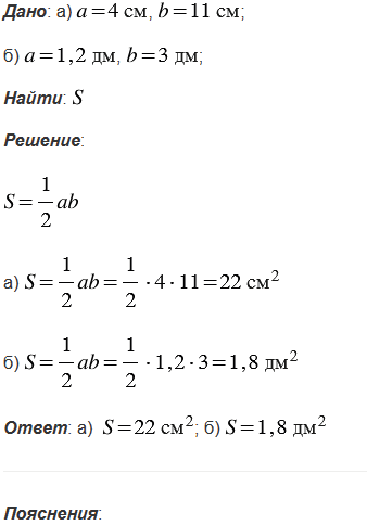 Найдите площадь прямоугольного треугольника, если его катеты равны: а) 4 см и 11 см; б) 1,2 дм и 3 дм.
