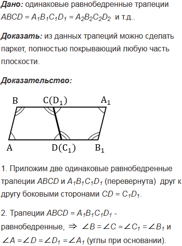 Докажите, что из одинаковых плиток, имеющих форму равнобедренной трапеции, можно сделать паркет, полностью покрывающий любую часть плоскости.