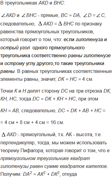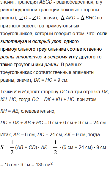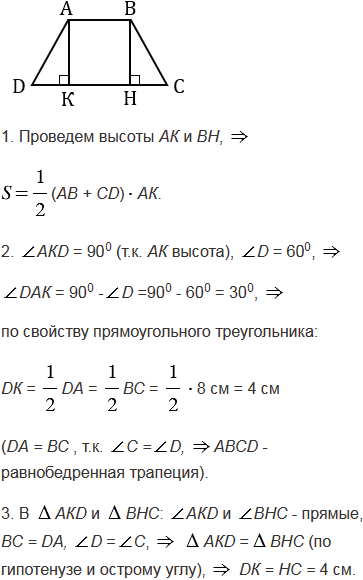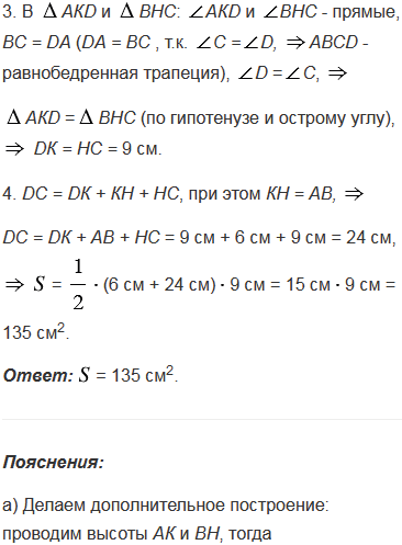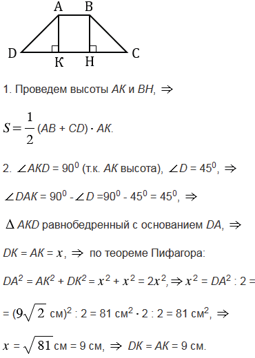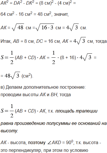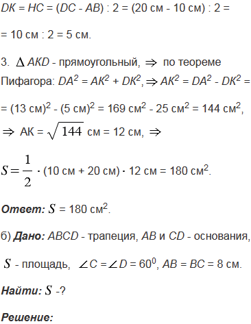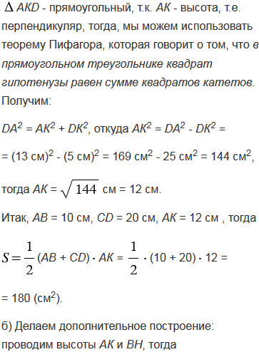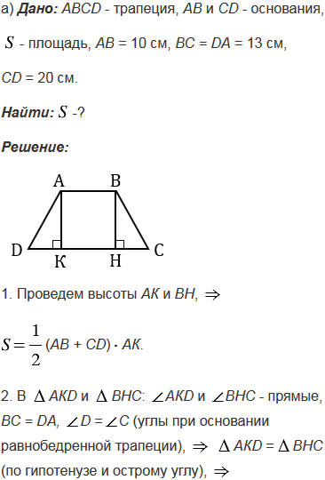 Найдите площадь трапеции АВСD с основаниями АВ и СD, если: а) АВ = 10 см, ВС = DА = 13 см, СD = 20 см; б)