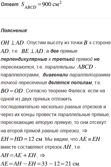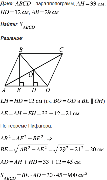 Меньшая сторона параллелограмма равна 29 см. Перпендикуляр, проведённый из точки пересечения диагоналей к большей стороне, делит её на отрезки, равные 33 см и 12 см. Найдите площадь параллелограмма.