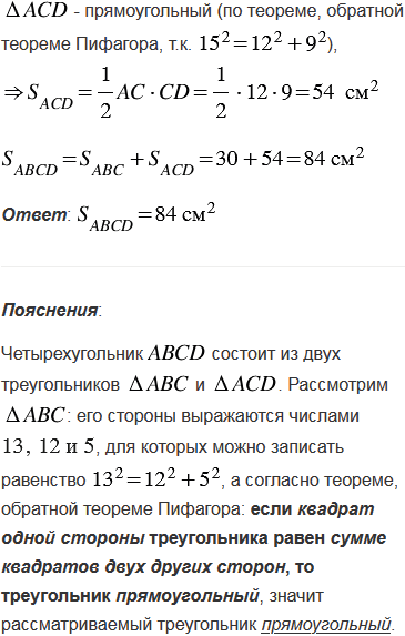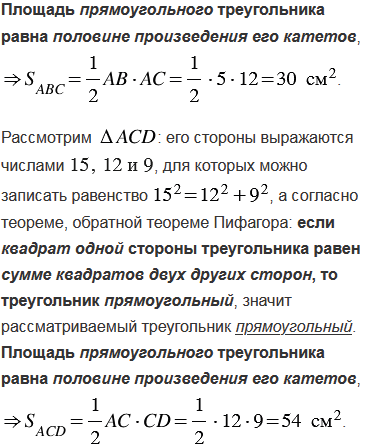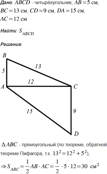 Найдите площадь четырёхугольника ABCD, в котором АВ = 5 см, ВС = 13 см, CD = 9 см, DA =15 см, АС = 12 см.