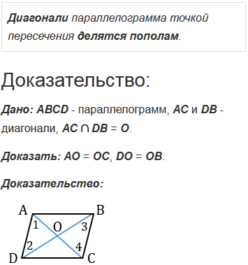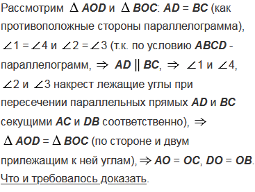 Докажите, что диагонали параллелограмма точкой пересечения делятся пополам.