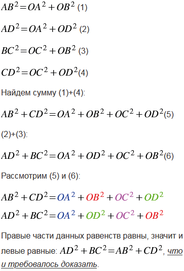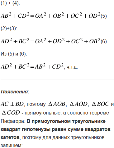 Докажите, что если диагонали четырёхугольника ABCD взаимно перпендикулярны, то AD2 + BC2 = AB2 +CD2.