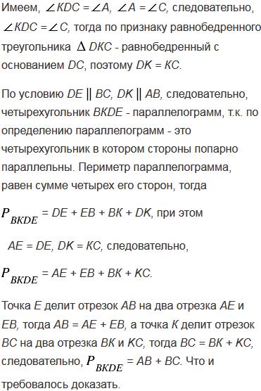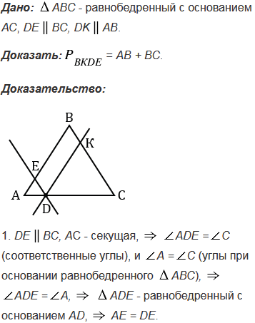Через произвольную точку основания равнобедренного треугольника проведены прямые, параллельные боковым сторонам треугольника. Докажите, что периметр получившегося четырехугольника равен сумме боковых сторон данного треугольника.