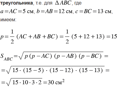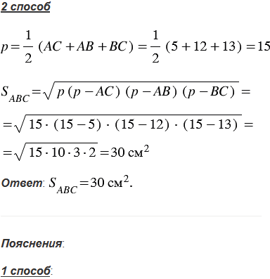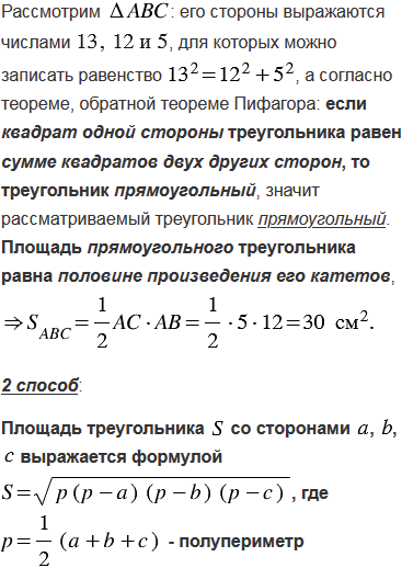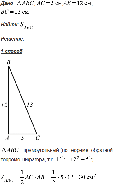 Стороны треугольника равны 13 см, 5 см и 12 см. Найдите площадь этого треугольника.
