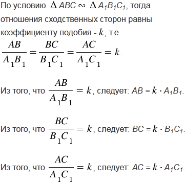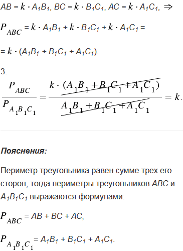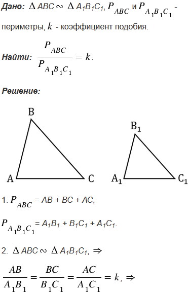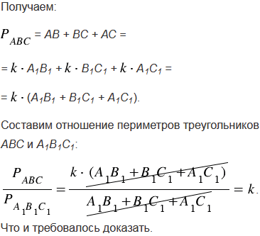 Докажите, что отношение периметров двух подобных треугольников равно коэффициенту подобия.