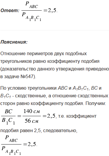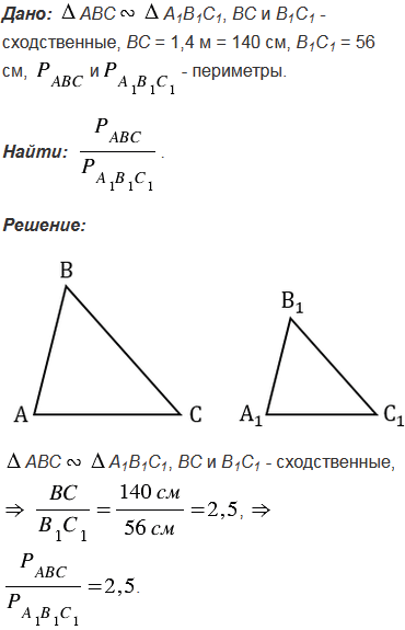Треугольники АВС и А1В1С1 подобны. Сходственные стороны ВС и В1С1 соответственно равны 1,4 м и 56 см. Найдите отношение периметров треугольников АВС и А1В1С1.