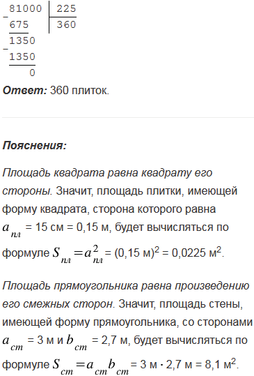 Сколько потребуется кафельных плиток квадратной формы со стороной 15 см, чтобы облицевать ими стену, имеющую форму прямоугольника со сторонами 3 м и 2,7 м?