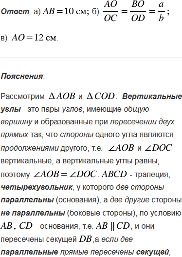 Диагонали трапеции ABCD с основаниями AB и CD пересекаются в точке О. Найдите: а) АВ, если ОВ = 4 см, OD = 10 см, DC = 25 см; б)