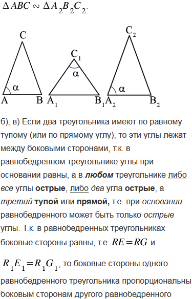 Подобны ли равнобедренные треугольники, если они имеют: а) по равному острому углу; б) по равному тупому углу; в) по прямому углу? Ответ обоснуйте.