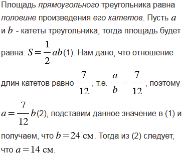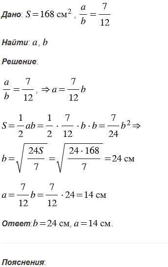 Площадь прямоугольного треугольника равна 168 см2. Найдите его катеты, если отношение их длин равно .
