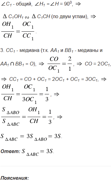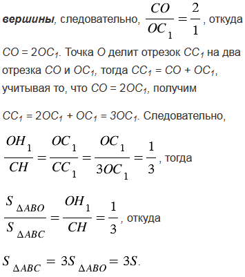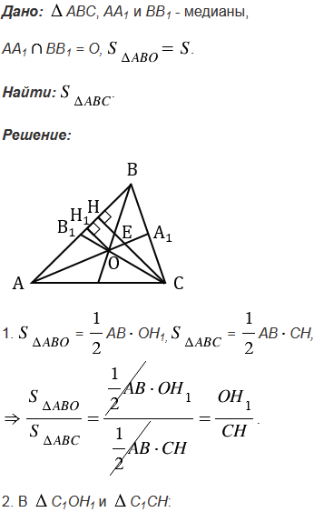 В треугольнике АВС медианы АА1 и ВВ1 пересекаются в точке О. Найдите площадь треугольника АВС, если площадь треугольника АВО равна S.