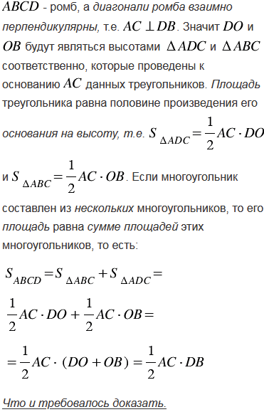 Докажите, что площадь ромба равна половине произведения его диагоналей. Вычислите площадь ромба, если его диагонали равны: а) 3,2 дм и 14 см; б) 4,6 дм и 2 дм.