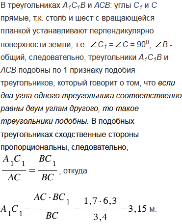 Для определения высоты столба А1С1, изображенного на рисунке 199, использован шест с вращающейся планкой. Чему равна высота столба, если ВС1 = 6,3 м, ВС = 3,4 м, АС = 1,7 м?