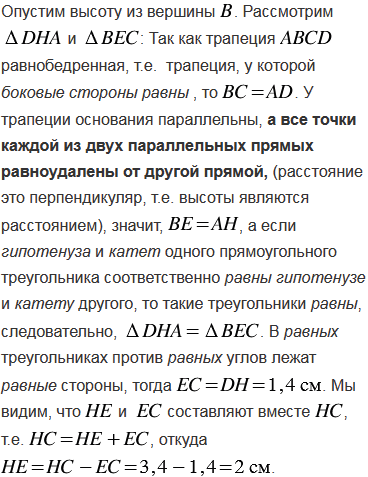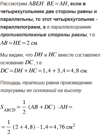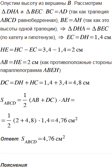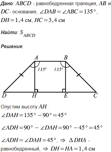 Тупой угол равнобедренной трапеции равен 1350, а высота, проведённая из вершины этого угла, делит большее основание на отрезки 1,4 см и 3,4 см. Найдите площадь трапеции.
