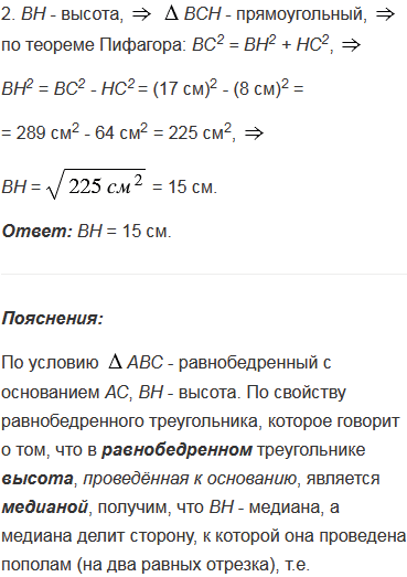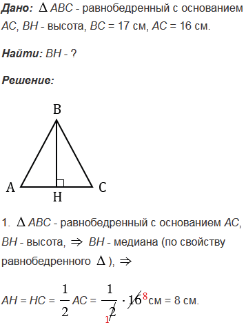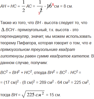 Боковая сторона равнобедренного треугольника равна 17 см, а основание равно 6 см. Найдите высоту, проведенную к основанию.