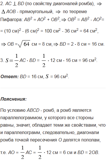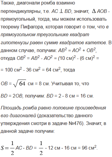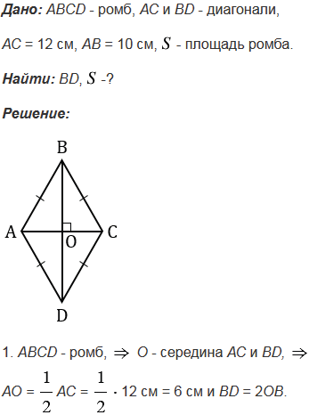 Найдите диагональ и площадь ромба, если его сторона равна 10 см, а другая диагональ равна 12 см.