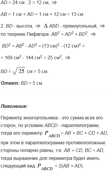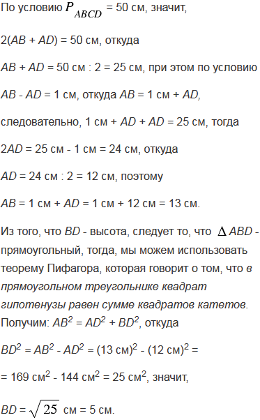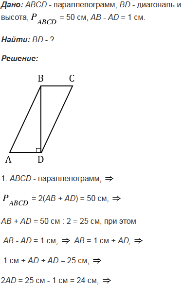 Одна из диагоналей параллелограмма является его высотой. Найдите эту диагональ, если периметр параллелограмма равен 50 см, а разность смежных сторон равна 1 см.
