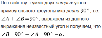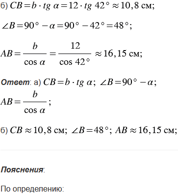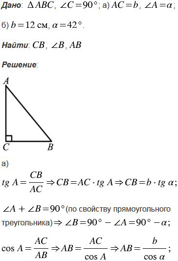 В прямоугольном треугольнике один из катетов равен , а прилежащий к нему угол равен . а) Выразите второй катет, прилежащий к нему острый угол и гипотенузу через и . б) Найдите их значения, если = 12 см,  = 420.