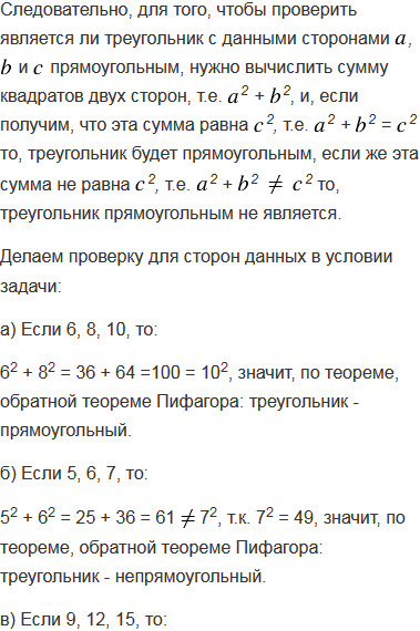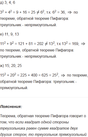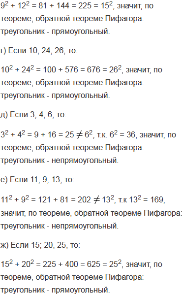 Выясните является ли треугольник прямоугольным, если его стороны выражаются числами: а) 6, 8, 10; б) 5, 6, 7; в) 9, 12, 15; г) 10, 24, 26; д) 3, 4, 6; е) 11, 9, 13; ж) 15; 20, 25. В каждом случае ответ обоснуйте.