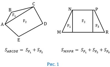 | 20. Если многоугольник составлен из нескольких многоугольников, то его площадь равна сумме площадей этих многоугольников. |