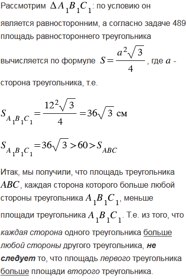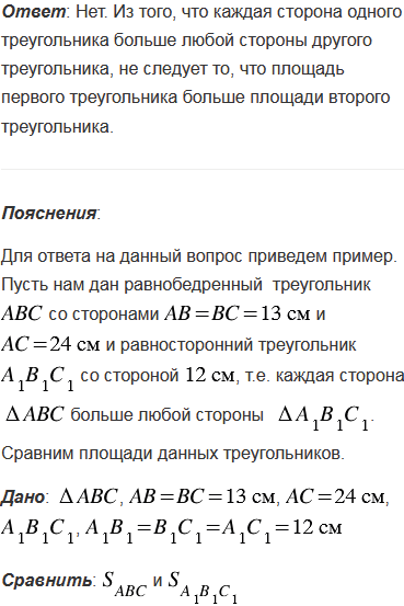 Каждая сторона одного треугольника больше любой стороны другого треугольника. Следует ли из этого, что площадь первого треугольника больше площади второго треугольника?