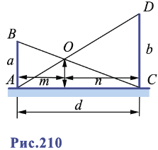установлены вертикально на некотором расстоянии друг от друга так, как показано на рисунке 210. Концы А и D, В и С соединены верёвками, которые пересекаются в точке О. По данным рисунка докажите, что: а)