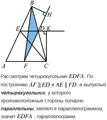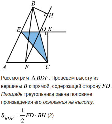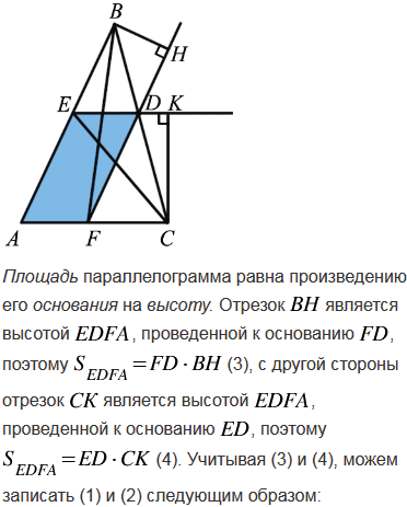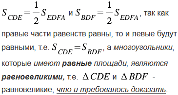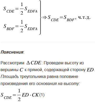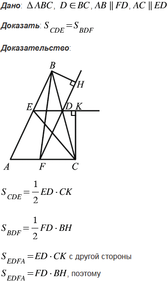 Через точку D, лежащую на стороне ВС треугольника АВС, проведены прямые, параллельные двум другим сторонам и пересекающие стороны АВ и АС соответственно в точках Е и F. Докажите, что треугольники CDE и BDF равновеликие.