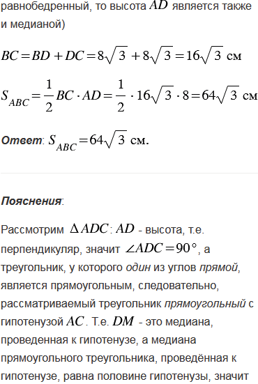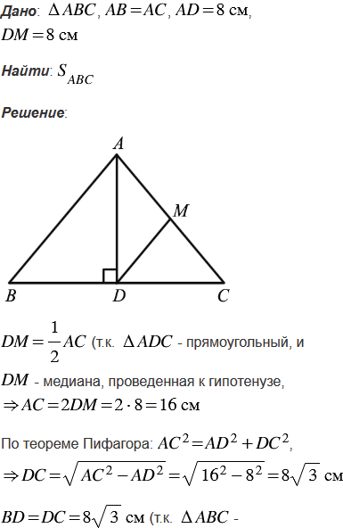 В равнобедренном треугольнике АВС с основанием ВС высота AD равна 8 см. Найдите площадь треугольника АВС, если медиана DM треугольника ADC равна 8 см.
