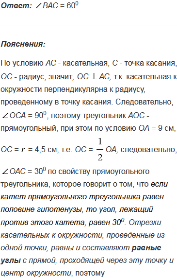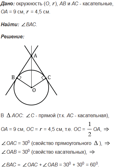 Даны окружность с центром О радиуса 4,5 см и точка А. Через точку А проведены две касательные к окружности. Найдите угол между ними, если ОА = 9 см.