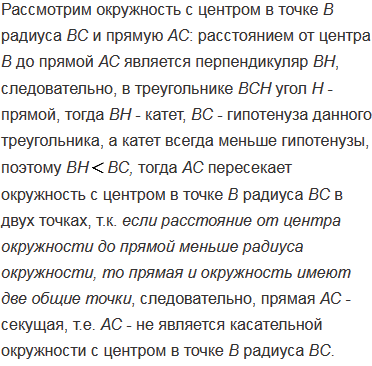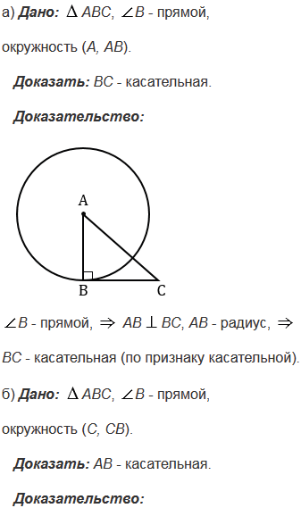 В треугольнике АВС угол В прямой. Докажите, что: а) прямая ВС является касательной к окружности с центром А радиуса АВ; б) прямая АВ является касательной к окружности с центром С радиуса СВ; в) прямая АС не является касательной к окружностям с центром В и радиусами ВА и ВС.