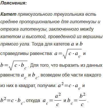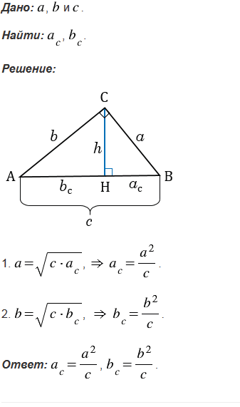 В данной задаче использованы следующие обозначения для прямоугольного треугольника АВС с прямым углом С и высотой СН: ВС = , СА = , АВ = , АН = , НВ = .