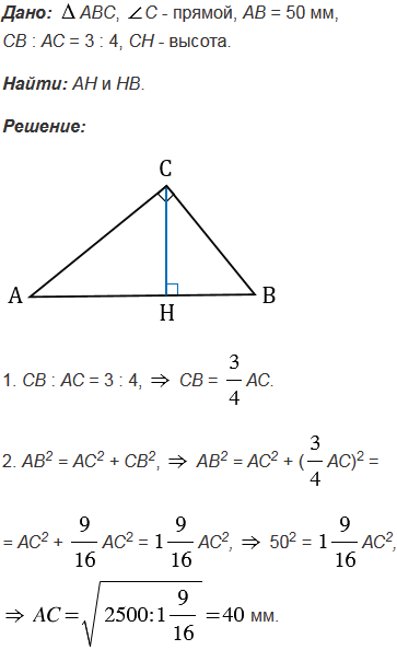 Катеты прямоугольного треугольника относятся как 3 : 4, а гипотенуза равна 50 мм. Найдите отрезки, на которые гипотенуза делится высотой, проведенной из вершины прямого угла.