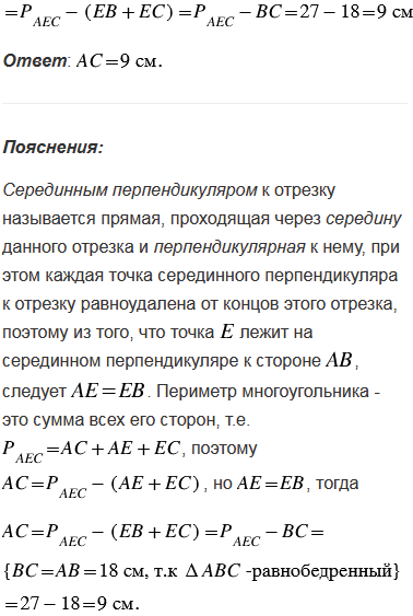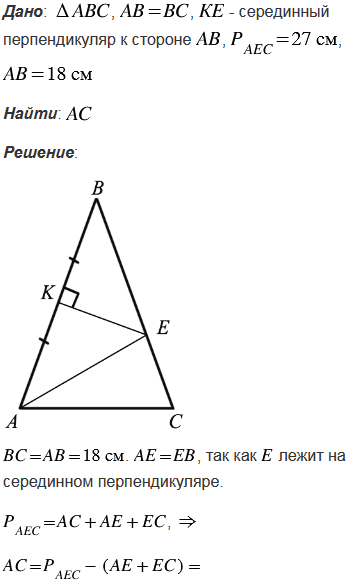 Серединный перпендикуляр к стороне АВ равнобедренного треугольника АВС пересекает сторону ВС в точке Е. Найдите основание АС, если периметр треугольника АЕС равен 27 см, а АВ = 18 см.