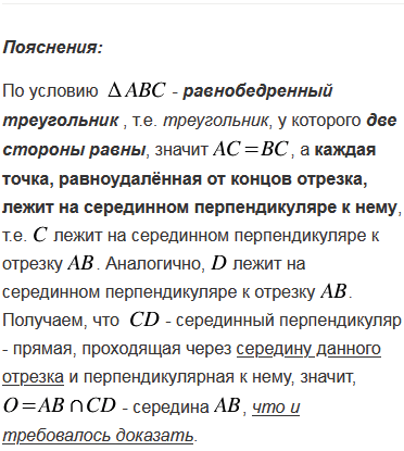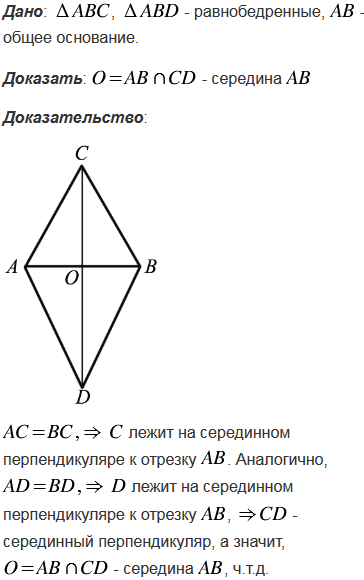 Равнобедренные треугольники АВС и АВD имеют общее основание АВ. Докажите, что прямая CD проходит через середину отрезка АВ.