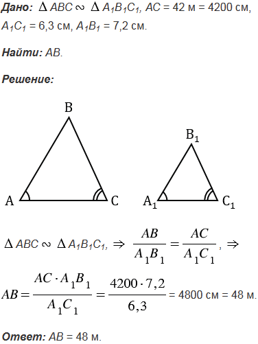 Для определения расстояния от точки А до недоступной точки В на местности выбрали точку С и измерили отрезок АС, углы ВАС и АСВ. Затем построили на бумаге треугольник А1В1С1, подобный треугольнику АВС. Найдите АВ, если АС = 42 м, А1С1 = 6,3 см, А1В1 = 7,2 см.