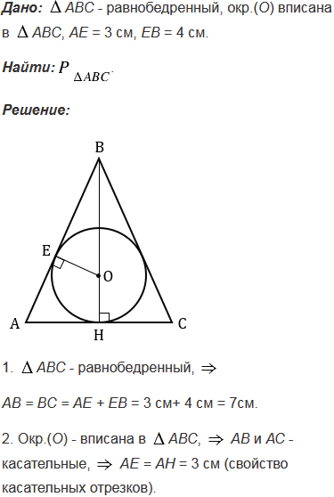 Точка касания окружности, вписанной в равнобедренный треугольник, делит одну из боковых сторон на отрезки, равные 3 см и 4 см, считая от основания. Найдите периметр треугольника.