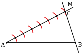Далее на АМ откладываем последовательно 7 равных отрезков (т.к. нам нужно разделить отрезок АВ в отношении 2 : 5, а 2 + 5 =7). Для этого с помощью циркуля строим последовательно 7 окружностей одинакового радиуса, при этом центр первой окружности лежит в точке А, а центр каждой последующей в точке пересечения предыдущей окружности с лучом АМ (полностью окружности строить необязательно, смотри выделенное красным цветом). Точку пересечения последней окружности с лучом АМ обозначаем буквой С, проводим прямую через точки В и С.