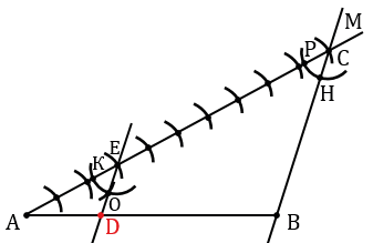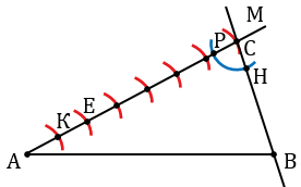 Обозначим точку пересечения второй окружности и луча АМ буквой Е и построим прямую ЕК параллельную прямой ВС. Для этого строим окружность произвольного радиуса с центром в точке С (полностью окружность строить необязательно, смотри выделенное синим цветом), точки пересечения данной окружности с лучом АМ и прямой ВС обозначаем буквами Р и Н соответственно.
