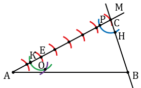 Затем строим окружность радиуса СН с центром в точке Е (всю окружность строить необязательно, смотри выделенное зеленым цветом), точку пересечения данной окружности с лучом АМ обозначаем буквой К. Измеряем с помощью циркуля расстояние РН и строим окружность с центром в точке К радиуса РН (всю окружность строить необязательно, смотри выделенное фиолетовым цветом цветом). Точку пересечения окружностей с центрами в точке Е и К обозначаем буквой О.