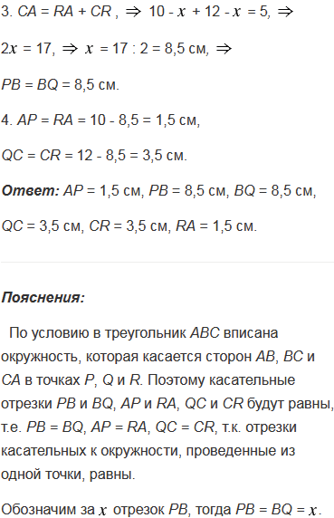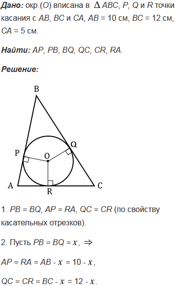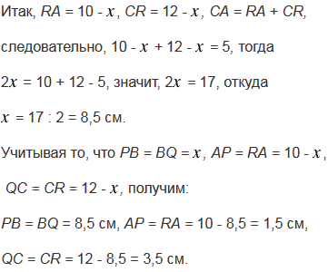 В треугольник АВС вписана окружность, которая касается сторон АВ, ВС и СА в точках Р, Q и R. Найдите АР, РВ, ВQ, QC, СR,, если АВ= 10 см, ВС = 12 см, СА = 5 см.